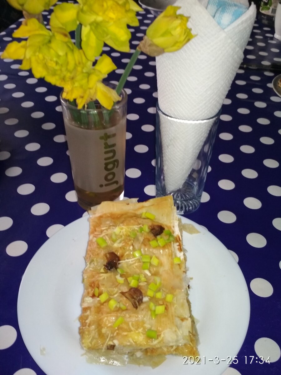 Тесто коре (в СНГ - "фило"), репчатый и зелёный лук, кукуруза, постный майонез, постный сыр, кетчуп.