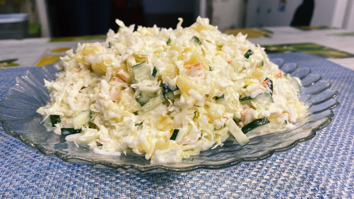 Салат , который ешь и не можешь остановиться! Салат с крабовыми палочками подойдет на любой праздник, гости обычно сметают его со стола за считанные минуты! Благодарим всех за лайки и подписку! Подписывайтесь на канал https://www.youtube.com/channel/UCe1wS25fZhxoRx6YOUwJUKQ Смотрите видео или рецепт ниже: Для приготовления нам потребуются: ананас консервированный - 1 банка огурцы свежие - 2 шт. крабовые палочки - 220 гр. пекинская капуста - 1шт. майонез - по вкусу Крабовые палочки освобождаем от пленки и мелко нарезаем на кубики. Верхнюю часть пекинской капусты меленько шинкуем. Два средних огурца нарезаем на небольшие кусочки. Добавляем огурцы с капустой в миску для салата. Берем колечки консервированных ананасы и нарезаем на небольшие кубики. Добавляем их в салатник вместе с крабовыми палочками к огурцам и капусте. Все тщательно перемешиваем, солить данный салат не нужно, заправляем салат майонезом и опять перемешиваем. Салат готов! Приятного всем аппетита и до скорых встреч! Е