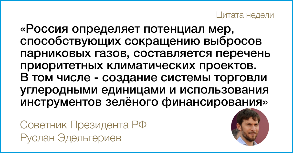 «Сегодня Россия определяет потенциал мер, способствующих сокращению выбросов парниковых газов, составляется перечень приоритетных климатических проектов. В числе этих мер - создание системы торговли углеродными единицами и использования инструментов зелёного финансирования. При этом очень важно, чтобы российские инструменты углеродного регулирования были синхронизированы с лучшими мировыми