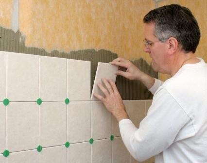 4. Продолжать укладку можно уже на следующее утро, снова 4-5 рядов, а вечером можно доложить еще, если в помещении не очень влажно и клей сохнет быстро. Таким образом, постепенно вы должны выложить плиткой все стены, до самого потолка. А в последнюю очередь закладывается плиткой декоративный экран под ванной. Не забывайте про межплиточные крестики – их должно быть по 2 штуки на каждый шов.
