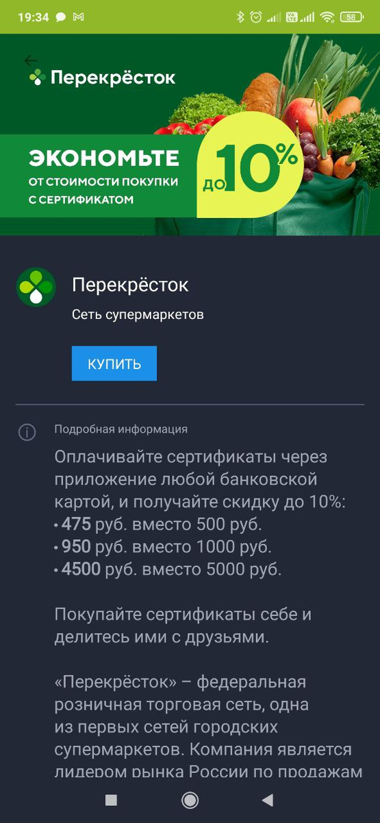 4. Сертификаты от Кошелька в перекрестке. Есть такое замечательное приложение - Кошелек, и там можно купить сертификат на покупку. Купить их можно прям там же, в приложении. Ими можно платить только на кассе, и это гарантированная скидка 10%. Иногда в приложении бывают скидки на покупку сертификатов. Правда, можно применить 1 сертификат на 1 покупку. Я обычно перед кассой прикидываю стоимость корзины, и покупаю серт на меньшую сумму, остальное доплачиваю картой.