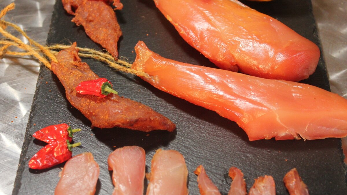 Ингредиенты: куриное филе- 2 кг нитритная + поваренная соль по 35 гр на 1 кг. всего 70 гр смесь приправ для суджука и бастурмы-25 гр вода - 75 мл шпагат Посол производим сухим способом обваливаем филе курицы смесью соли и кладём в холодильник на 3- 5 дней Готовим соус из воды и специй и обмазываем кусочки когда подсохнут. . Можно обмазывать 2 раза .