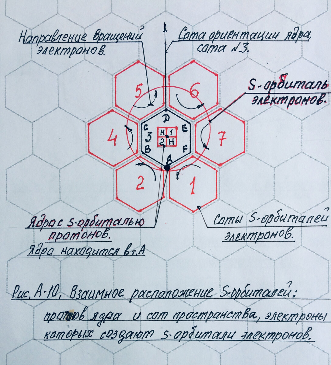 Соты 1, 2, 4, 5, 6, 7, электроны которых связываются с протонами ядра, кольцом окружают соту ориентации. Потоки электронов в виде дуг распространяются над сотой ориентации для того, чтобы связываться с протонами.