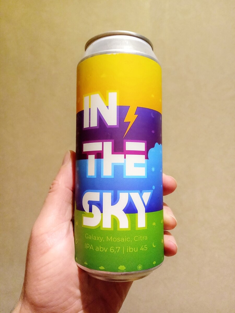 Как, наверное, все догадались, у меня есть еще баночка пива от подмосковной пивоварни DomBrew. И сегодня это опять IPA, только на этот раз без добавления какого-либо сока. Оформление яркое, но при этом довольно скромное. Почти все характеристики представлены на лицевой стороне банки (недостающая указана сзади), так что не надо искать все это в интернетах. Пивовары в очередной раз описывают свое творение очень немногословным образом: In the sky - небесно ясная IPA с сочетанием хмелей Citra, Mosaic и Galaxy. Кстати, как видите, они характеризуют пиво как просто IPA, а на "тапке" указано, что это American IPA. Кто прав? Попробуем разобраться под соответствующий саундтрек. ТТХ: Алкоголь - 6.7% Плотность - 17% Горечь - 45 Хмель - Citra, Mosaic, Galaxy Пиво темно-янтарное с оранжевыми оттенками, мутное, непрозрачное. Пены не очень много, держится недолго. В ароматике преобладает персик (спасибо Galaxy). Остальное практически не ощущается. А вот во вкусе ситуация обратная - на первом месте т