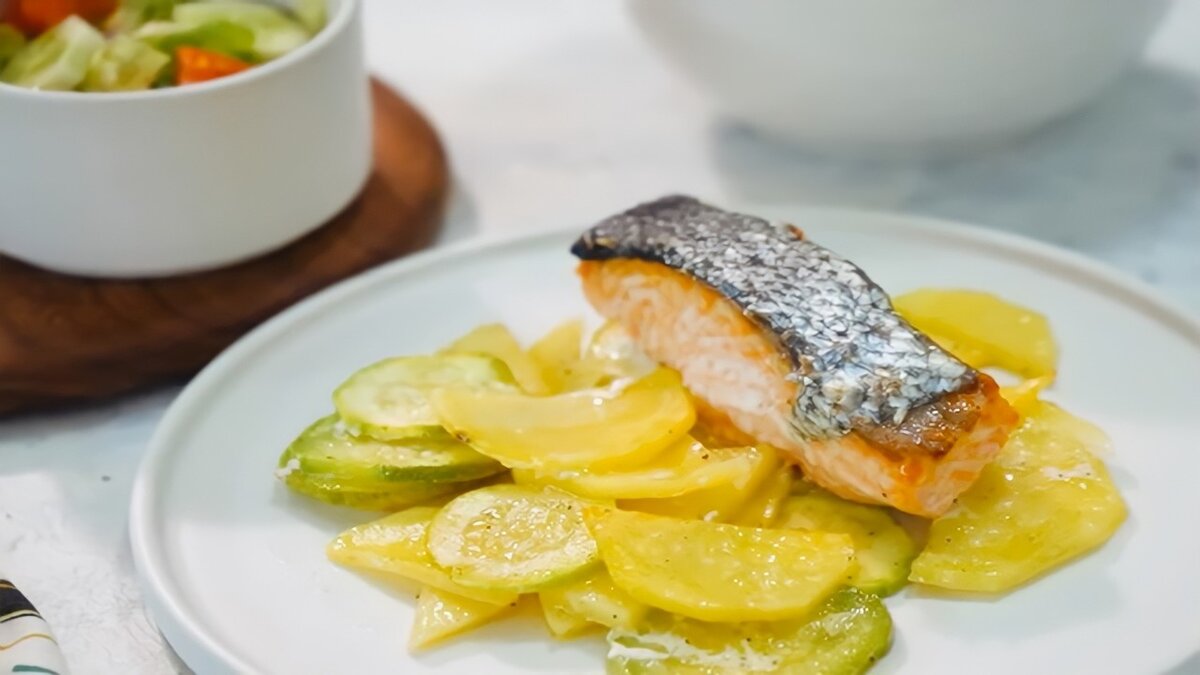 Всех приветствую! Сегодня я предлагаю вам приготовить блюдо, которое в Турции называется Fırında Balık Tarifi – Лосось в духовке. Рыбу будем запекать с картофелем и кабачком. Рыба идеально сочетается с овощами, а при таком способе приготовления сохраняются все ее полезные качества. При желании лосось можно заменить на любую другую красную рыбу. На стол запеченная рыба подается с салатом из свежих