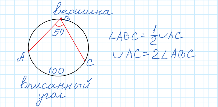 Вписанным называется угол, вершина которого находится на окружности, а стороны угла пересекают эту окружность.
