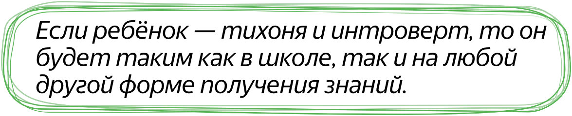 Плюсом в моей аргументации было то, что если ребёнок — тихоня и интроверт, то он будет таким как в школе, так и на любой другой форме получения знаний. Нам в этом плане было проще из-за новаторско-педагогического подхода мамы.