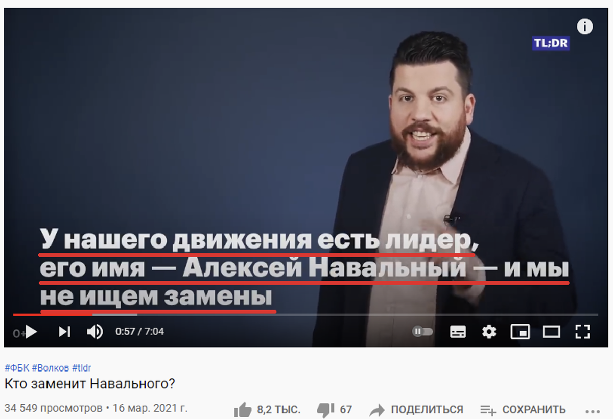 В своем ролике от 16 марта «Кто заменит Навального?» Волков заявил , что сторонники блогера не собираются искать ему замену и не смирились с тем, что оппозиционер сидит в тюрьме – хотя не рассказал, какая именно работа ведется по его освобождению: «У нашего движения есть лидер, его имя – Алексей Навальный. И мы не проводим никакого кастинга и не ищем замены…Мы не смиряемся с тем, что Алексей в тюрьме ».
