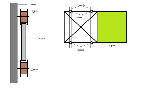 Для начала, прикинул как можно сделать просто и с минимальными затратами. Оговорюсь сразу, ворота будут лёгкими. Первое что пришло на ум, четыре ролика крепим к столбам забора, два швеллера один в низ а второй на верх ворот. Всё, ворота готовы.