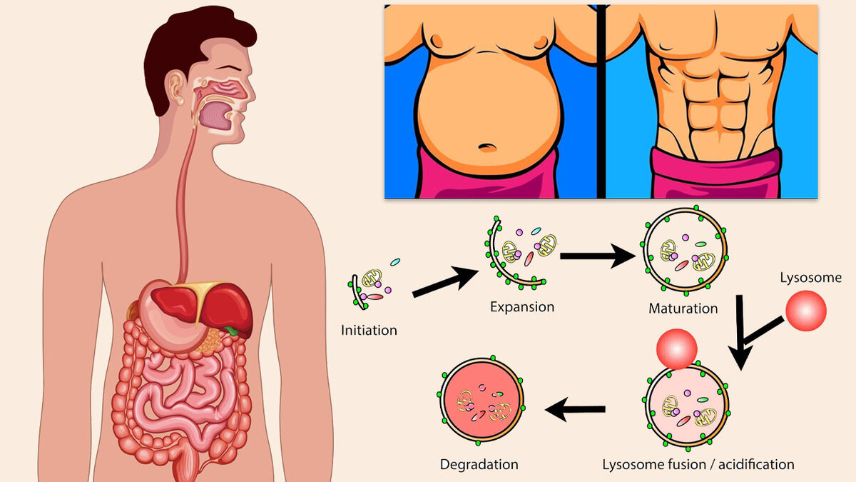 Аутофагия- это процесс, при котором внутренние компоненты клетки доставляются внутрь её лизосом или вакуолей и подвергаются в них деградации. Аутофагия является естественным, регулируемым механизмом клетки, который разбирает ее ненужные или дисфункциональные компоненты. Короче говоря, это механизм самоочищения клетки. Все лишнее и ненужное уничтожается, а из полученных аминокислот строятся новые белковые структуры. Это явление, кстати, и объясняет стабильный уровень аминокислот в крови, в первые сутки- двое после начала голодания.