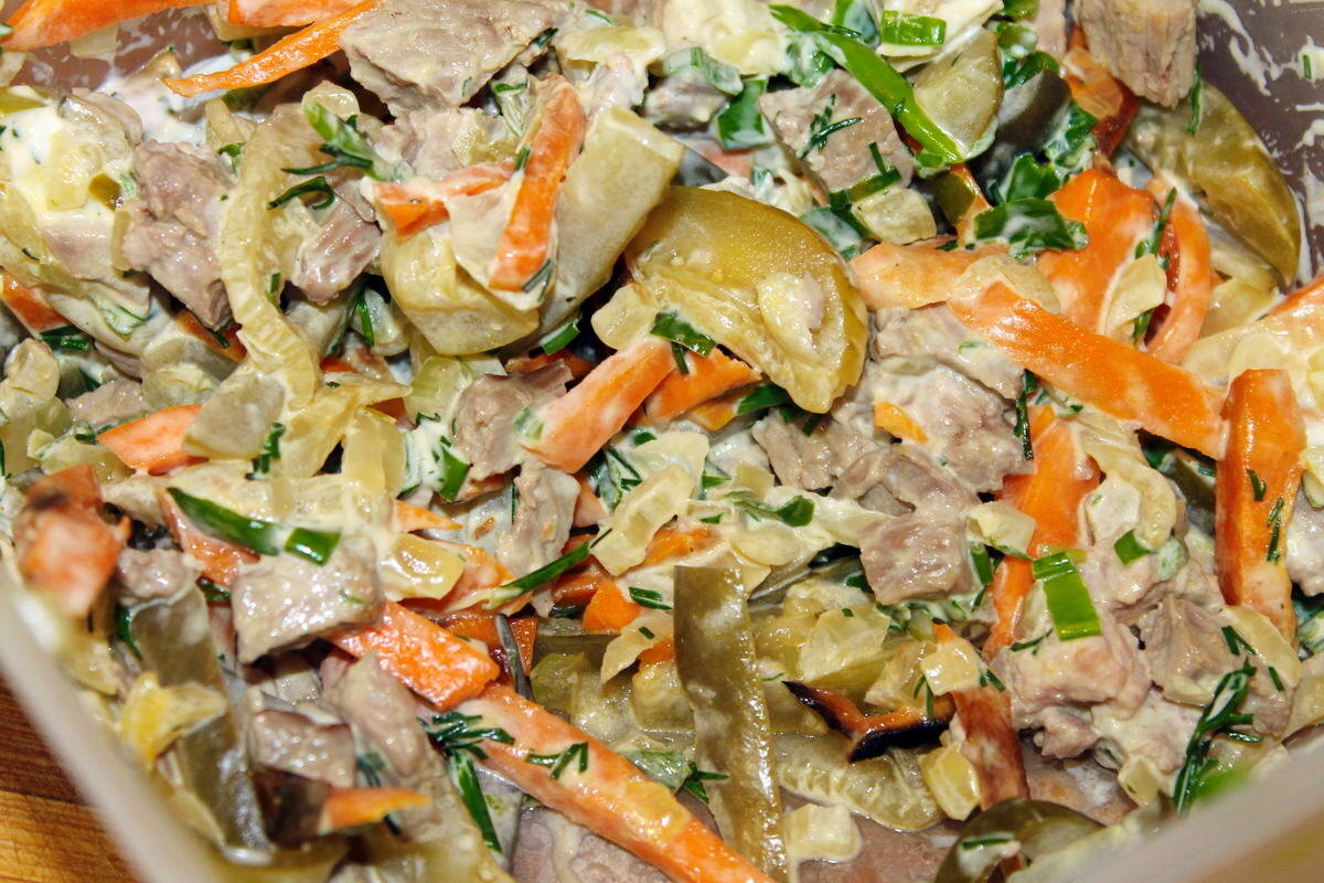 Смешиваем все ингридиенты и перед подачей заправляем майонезом.