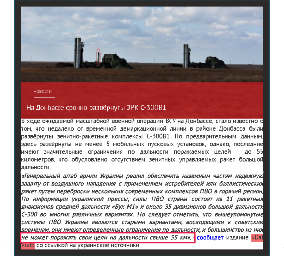 С-300 ПТ/ПС на позиции вблизи ЛДНР не выдвигались. Три дивизиона С-300ПС уже были развёрнуты вблизи Мариуполя ещё в 2019 году. Скажу только, что именно эти комплексы имеют на вооружении ЗУР 5В55. Видимо это обозначение и сбивает с толку диванных экспертов и «обозревателей». На самом-то деле самые первые такие ракеты, модификации «К» обеспечивали дальнюю границу зоны поражения 47 км, более новые «Р», которые и наличествуют в дивизионах С-300ПТ/ПС могут поражать цели на дальности 90км. Новее у украинцев ничего нет. Что касается Бук-М1, то его дальняя граница ЗП всего 35 км, упоминать рядом с ним про 55 км вообще не имеет смысла. С-300В1, как покажу дальше, имеет дальность 72 км. То есть действительно цифра 55 взята из типа ракет.