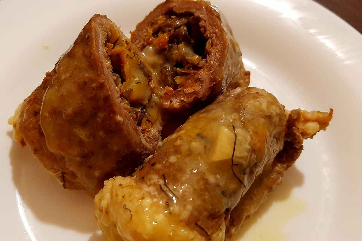 Предлагаем рецепт простого, сытного и вкусного блюда — рулетиков с грибами в сметанном соусе.
