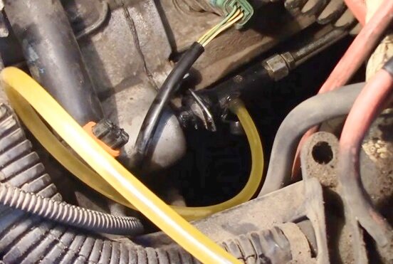 Штуцер для прокачивания гидросистемы расположен в месте стыковки коробки передач с двигателем. Искать следует небольшой отросток с отходящей от него магистралью. Корпус расположен сбоку на фланце.
