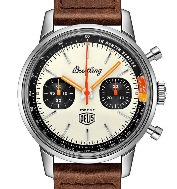 Австралийская компания Deus Ex Machina обрела известность как создатель ярких кастом мотоциклов. Но теперь компания развилась до “lifestyle” бренда, а также выпускает одежду и экипировку для мотоциклистов и сёрферов. Недавно часовой бренд Breitling представил винтажный хронограф совместно с Deus Ex Machina. Модель Breitling Top Time Deus Limited Edition будет выпущена ограниченным тиражом 1500 экземпляров.