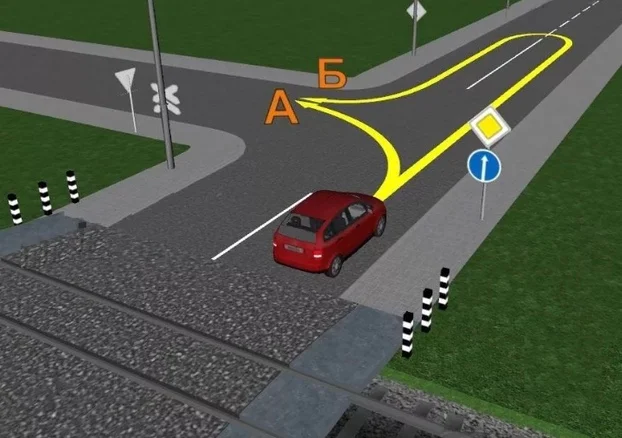 После проезда железнодорожных путей красный авто, попал на Т - образный перекресток.