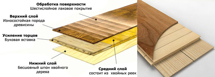 Инженерная доска. Довольно молодой вид паркета, стремительно набирающий популярность. Состоит из двух основных слоёв и лакового покрытия: