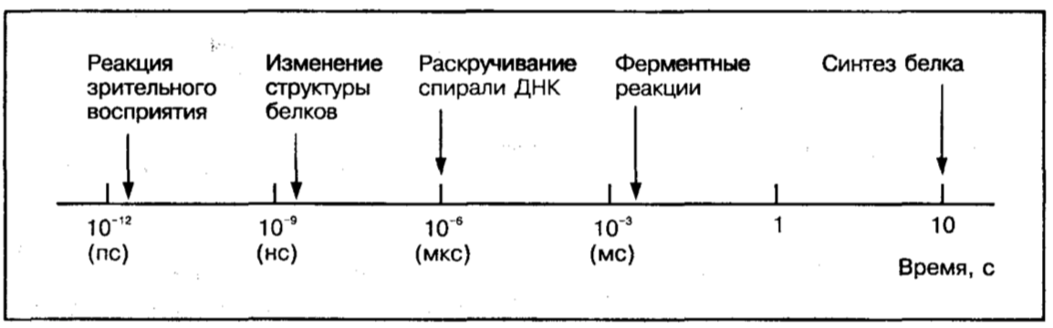 Так, скорость многих ферментативных реакций составляет несколько миллисекунд, конформационные изменения спирали ДНК — микросекунды, а скорость реакций, обеспечивающих зрительное восприятие, — в пределах пикосекунд.