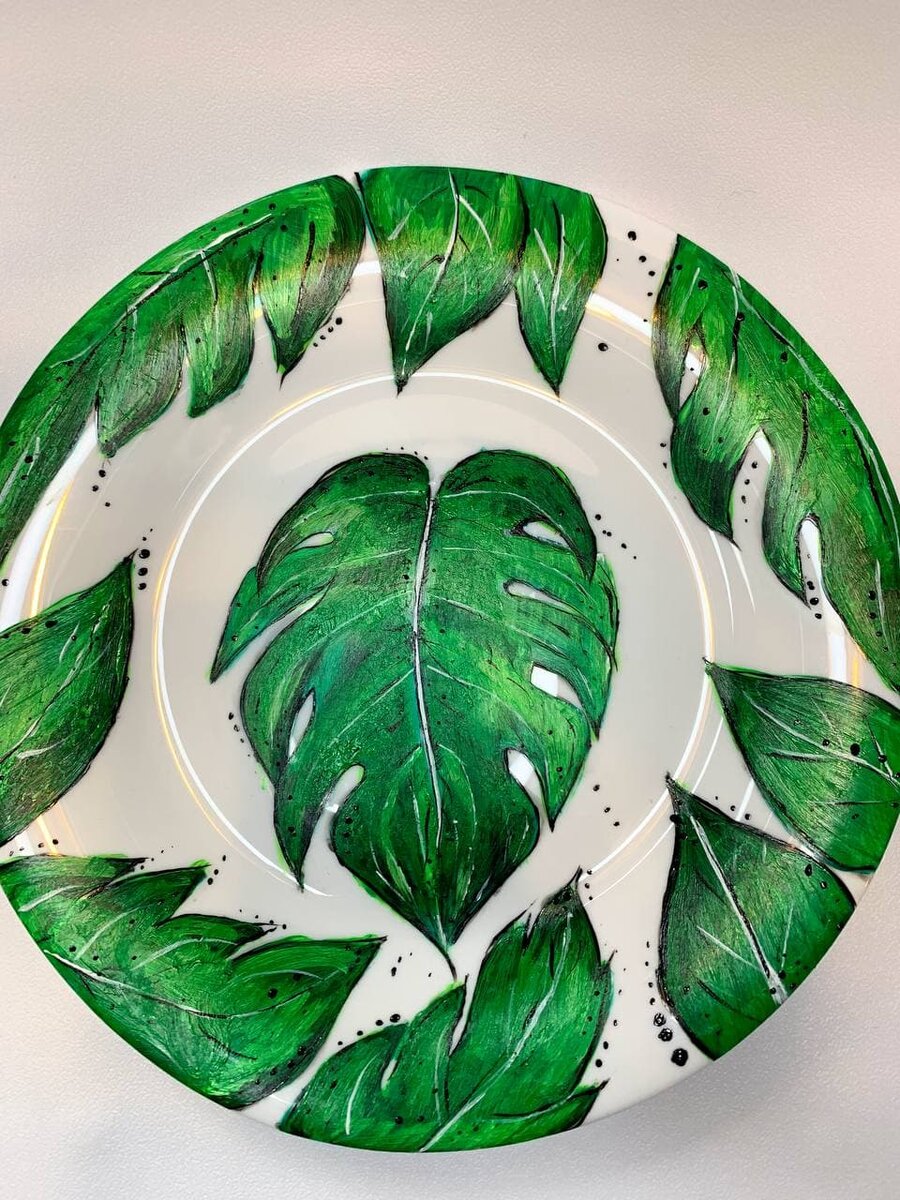 С недавних пор практикую живопись на посуде! В этот раз решила окунуться в тематику флоры и перенести "Джунгли" на тарелку в подарок маме😊