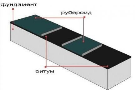 На дренажную подушку выставляется опалубка и заливается фундамент. Как только бетон застынет, необходимо осуществить гидроизоляцию фундамента в бане своими руками. Для этого используется вертикальная и горизонтальная гидроизоляция фундамента. Лучше всего использовать в данном случае нанесение битумной мастики, поверх которой клеится в 1-2 слоя рубероид. Обязательно вертикальную и горизонтальную гидроизоляцию фундамента необходимо тщательно заизолировать на стыках.