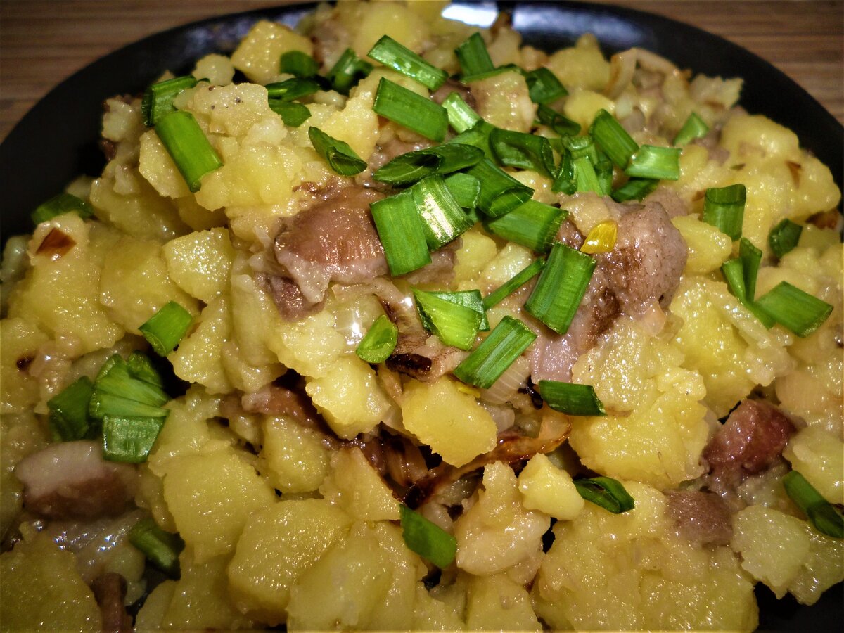 Выложить в чашку с картошкой все содержимое сковороды, посолить, при желании поперчить, перемешать. Если салат покажется суховатым, можно добавить растительного масла.