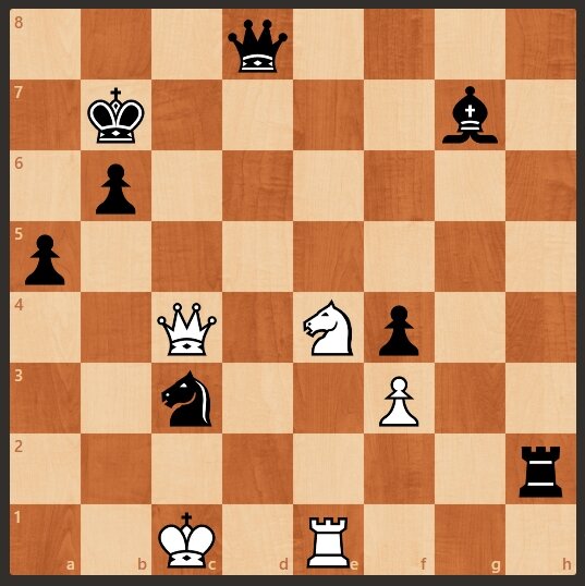 Фрагмент партии Гольдин - Рябов, 1972 год. У черных материальный перевес в виде двух пешек и слона. Черные планируют забрать белого коня и дать шах ферзем на d2, с последующим матом. Но белые начинают и партия заканчивается в ничью.