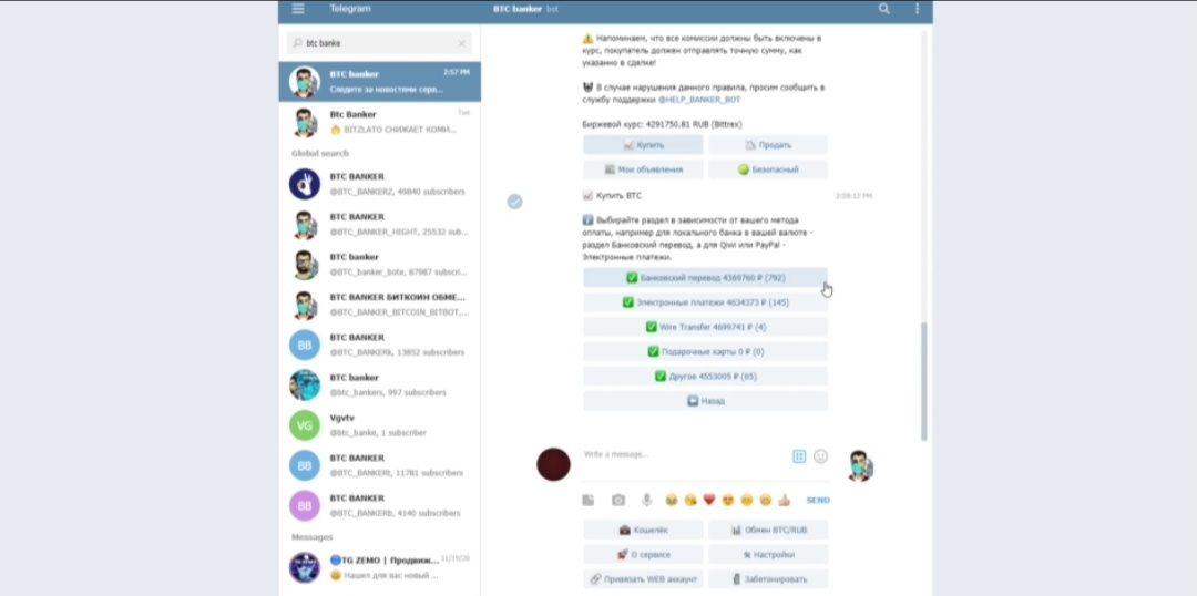 Первым делом заходим в телеграмм и находим в поиске "btc banker"