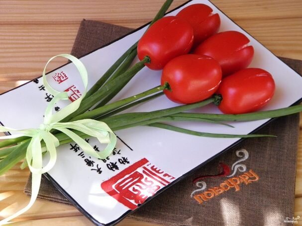 5. Сделайте стебельки. Для этого зеленый лук (перо) вымойте и обсушите салфеткой. Внутрь вставьте бамбуковый шампур. острым концом воткните стебель в головку цветочка. Первый тюльпанчик готов