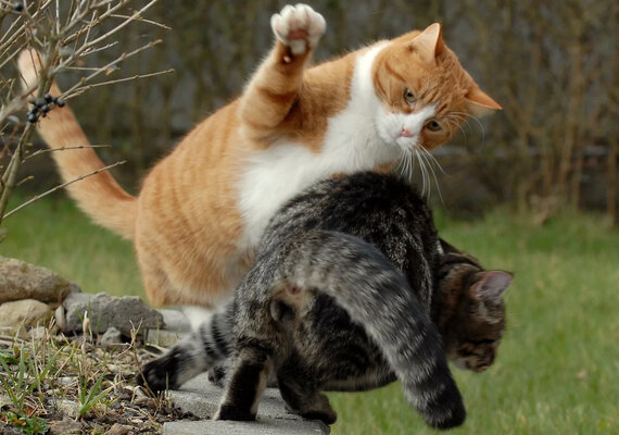 Для начала стоит найти причину агрессии, ведь каждый случай индивидуален. Зачастую дело кроется в том, что домашний любимец не имел контактов с представителями своего вида. Столкнувшись с незнакомым гостем, он демонстрирует агрессию как защитную реакцию на стресс. Пол особи играет немаловажную роль, ведь природа обязывает самца защищать свои владения. Долго живя в одном месте, нельзя не считать его своим домом. Иногда хозяева неосознанно подливают масла в огонь, пытаясь успокоить разъярённое животное. В такой ситуации любимца нельзя гладить, говорить ласковые слова и угощать едой. Это закрепляет паттерн плохого поведения. Наказывать за это нужно, но кричать, кидаться предметами и поднимать руку на пушистое создание недопустимо. Лучше воспользоваться пульверизатором с водой. Достаточно один раз пшикнуть на зарождающийся конфликт, чтобы кошки резко перестали выяснять отношения.