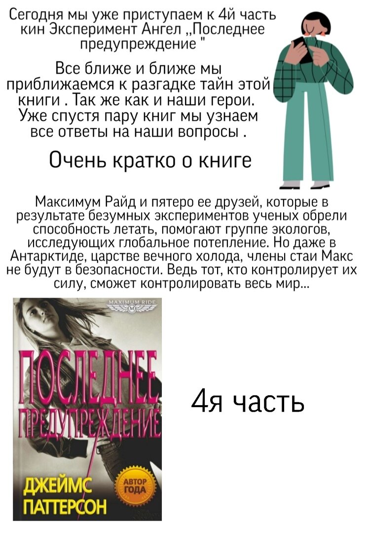 Краткое содержание : Закончилось в 3й части все тем что они прилетели после той битвы в ИТАКСЕ и смерти Ари. А 4я часть начинается похоронами Ари. Все грустят и плачут и даже Клыку его стало жаль . После его захоронения к стае подходит Джеб и Мартинез и говорят что после случившегося в Германии с ними связались влиятельные люди . И что им и стае необходимо поехать в Вашингтон для встречи с ними . Сказали что они были на стороне Макс и других . Макс задумалась но потом дала решительный ответ " нет" так как Джебу она больше не верит . Но уже маме она поверила и они решили лететь на самолете в Вашингтон . В самолете у Надж прояснилась новая способность . Она могла притягивать к себе железные предметы когда это захочет . И весь оставшийся полет они экспериментировали с ее способностью . У Клыка в блоге сбился счетчик и поэтому отчет просмотров пошел заново. В это рах он написал там о смерти Ари и о том что они направляются на важную секретную встречу в Вашингтон . Сестра Макс Элла осталась в Аризоне . По приезду Мартинез и Джеб отвели стаю в дом их временного пребывания , где они привели себя в порядок , одели чистые вещи и немного отдохнули . Вдруг у Макс снова в голове заговорил голос - который говорил ей что эта встреча очень важна и что бы Макс ее не испортила . Она думала это Джеб в ее голове но голос сказал что Макс знает не все и это уже не Джеб . Время встречи . В Капитолии их встретили . И начали разговор длившийся около часа о жизни детей мутантов о детве , прошлом , и так далее . Они предложила создать для таких детей как стая школу , где им будет безопасно находится и жить спокойно . А у ученых будет возможность их изучать ( исследовать способности , физические и биологические свойства ) . В ответ на это Макс устроила почти что истерику . Она не хотела такого , она боялась что они снова будет в клетках и тому подобное . Поэтому на этой встрече ничего решить не удалось. Пока они седили вс воем доме временного проживания и обсуждали произошедшее у Игги тоже открылась новая способность . Он вслепую мог сказать что какой имеет цвет . И стая начал проверять эту способность давая ему в руки предметы , а он говорил их цвет . Но их занятие было прервано звонком в дверь . Это курьер принес 9 пицц . Все мигом побежали разбирать их. Макс начала кричать что следующая пицца ее и когда ее мама начала класть ей кусок пиццы Газии закричал что то его пицца . Макс не со зла напала на Гази закричал что бы все шли в укрытие . Произошел взрыв ....Вроде бы все уцелели . Все тут же собрались и покинули это место полетев на следующий дом . Ночью Клык предложил Макс полетать по ночному небу . Клык начал разговор и сказал что он снова хочет быть вместе с Макс. Потому что после их расставания ему без нее было плохо . ( кто не помнит в 3й части из за того что Клыку был не по душе Ари Клык разделил стаю и оставил Макс ). И пока Макс смотрела на него в недоумении он взял ее руку и поцеловал . Руки Клыка крепко обнимали Макс . С ним Макс было хорошо , она чувствовала спокойствие , но в то же время очень боялась этих чувств . И ей все же завладела паника ,она толкнула Клыка и взлетела .