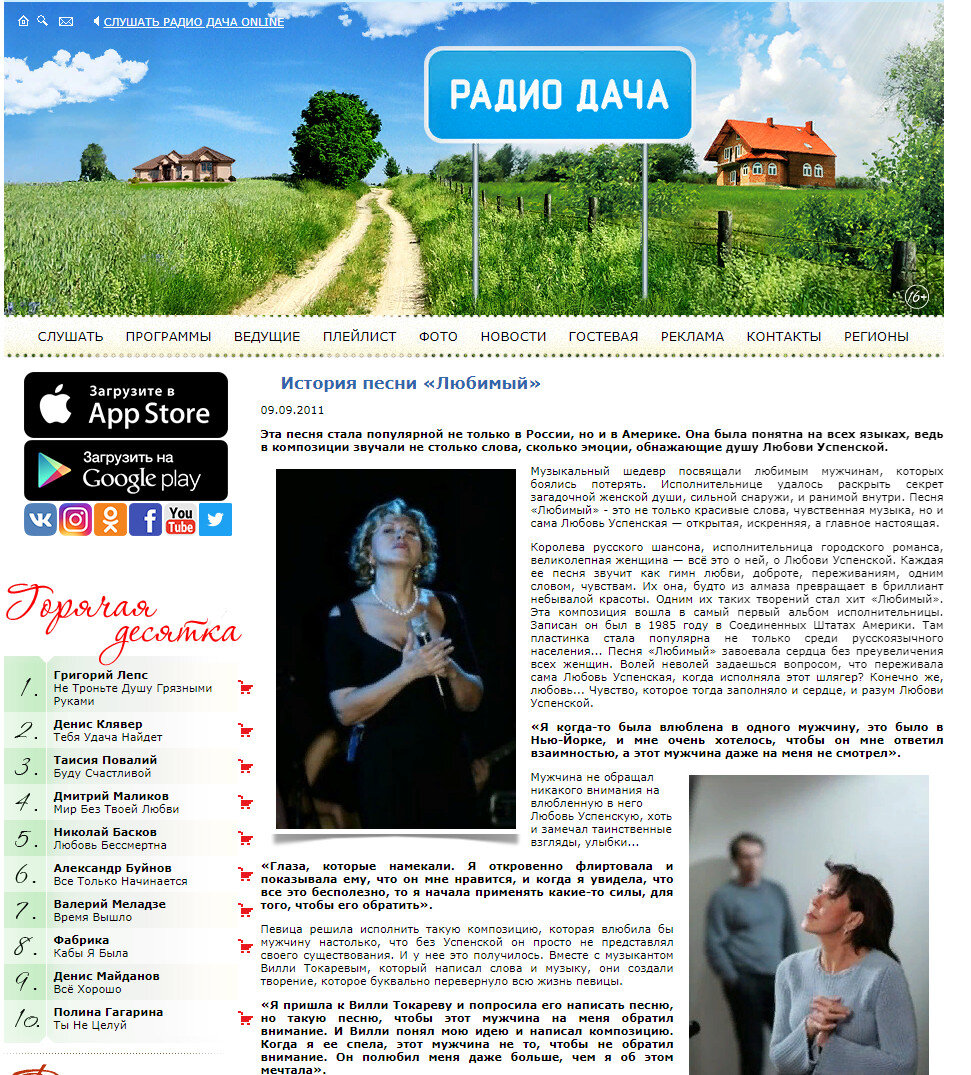 Наверное не простая задача найти человека, который бы не слышал знаменитый шлягер Любови Успенской "Любимый". Много лет певица включает эту песню в концертные репертуары, в теле и радиопередачи. Интересна история её создания. По словам исполнительницы, автором слов и музыки является Вилли Токарев и написана песня для Успенской по её просьбе. Вот страничка с сайта "Радио дача", где певица