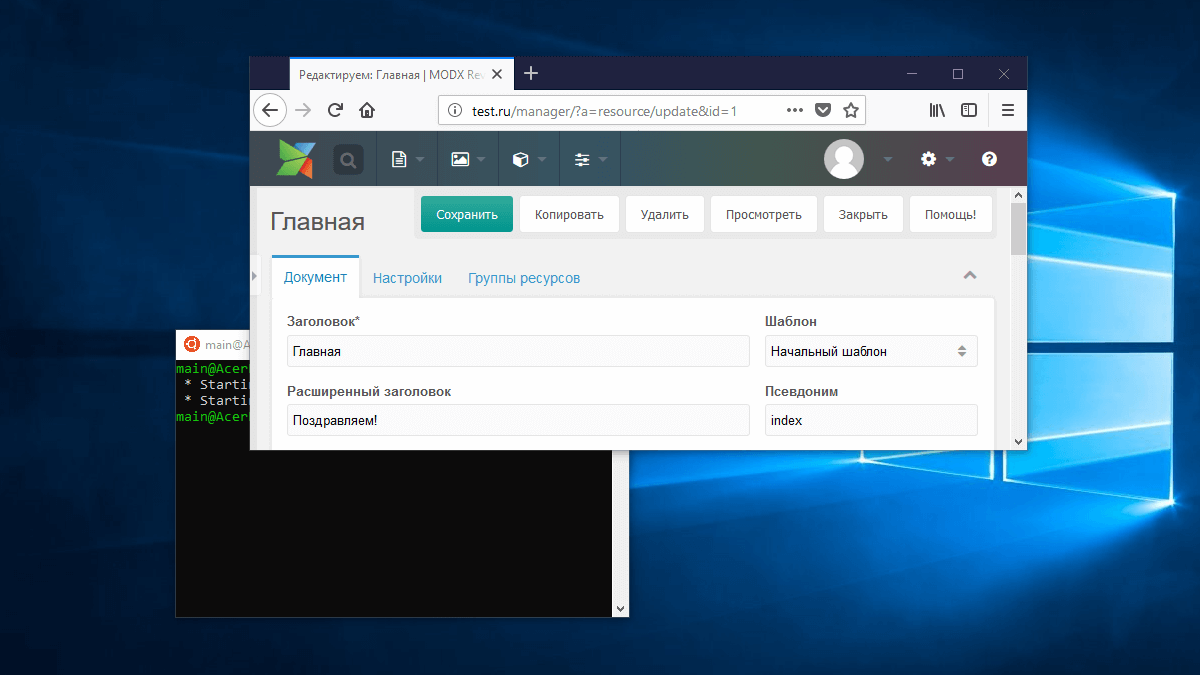Длы проверки работоспособности веб-сервера установим на test.ru систему управления контентом, например, MODX Revolution.