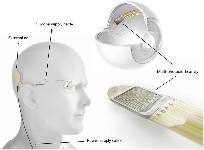 IRIS II (Pixium Vision) и Argus II (Second Sight) имели внешние устройства (очки с видеокамерой и блок обработки видеосигнала). Слепой человек смотрит при помощи камеры, с нее картинка направляется в процессор, где изображение обрабатывается и распадается на 60 пикселей (для системы Argus II). Затем сигнал направляется через трансмиттер на электродную решетку, вживленную на сетчатке, и электрическим током стимулируются оставшиеся живые клетки.