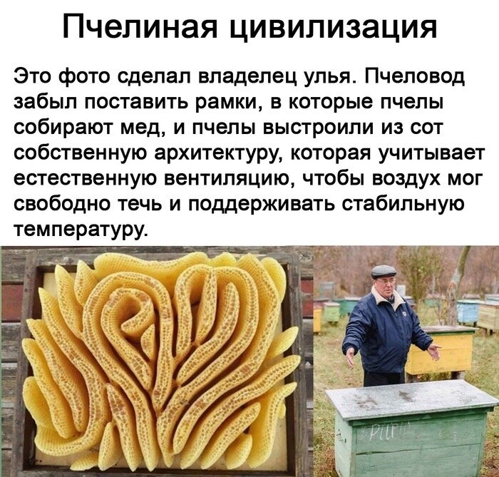 ЕСЛИ пчеловод забыл поставить рамки , в которые пчелы собирают мед, и пчелы выстроили из сот собственную архитектуру, которая учитывает естественную вентиляцию, чтобы воздух мог свободно течь и поддерживать стабильную температуру.