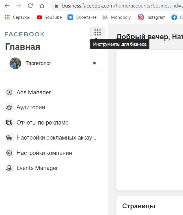 Далее в инструкции описаны все необходимые пункты, которые понадобятся для сотрудничества с таргетологом. 1. Ваша страничка в инстаграм - это бизнес-аккаунт? 2. У вас есть бизнес-менеджер (БМ) в Facebook? Переходим по ссылке https://business.facebook.com (необходимо быть авторизированным в своем аккаунте) и нажимаем "Создать компанию". Заполняем данные. Готово! 3. В вашем БМ есть рекламный аккаунт (РА)? Заходим во вкладку "Инструменты для бизнеса". В открывшемся меню выбираем "Настройки рекламных аккаунтов". (Если эта кнопка есть в быстром доступе, идем сразу туда). Создаем рекламный аккаунт, добавляем в него платежную информацию. 4. Выдаем партнерский доступ в вашем Бизнес Менеджере для таргетолога. Во вкладке "Инструменты для бизнеса" заходим в "Настройки компании". Далее листаем меню слева вниз и переходим в "Информация о компании". Копируем идентификатор своего Бизнес-менеджера и отправляем таргетологу. Далее на вашу электронную почту, которую вы оставляли вашему специалист
