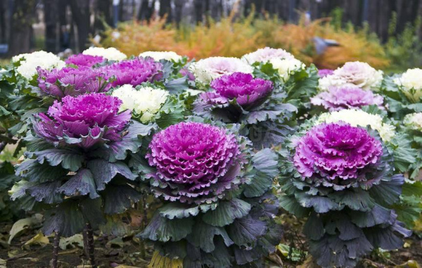 Высадка декоративной капусты в цветники. В цветочные композиции и клумбы капусту высаживают так, чтобы в первые 1,5–2 месяца она была скрыта другими растениями, поскольку в это время она выглядит довольно невзрачно. Свой привлекательный и неотразимый вид декоративная капуста приобретет только к августу, и в таком виде останется довольно долго, иногда до конца декабря и даже дольше, стойко перенося морозы до – 14° С.