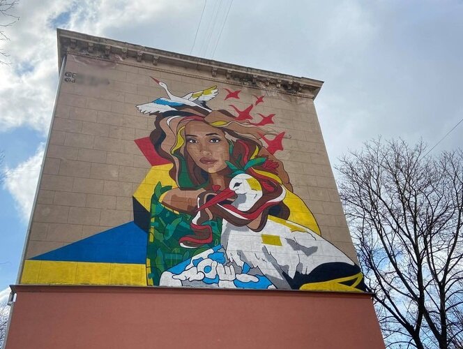 На стене дома в центре Николаева Ольгу Шарий нарисовали. Ну, или похожую на нее женщину. С аистами. В национальном украинском колорите, так сказать. Получилось красиво.