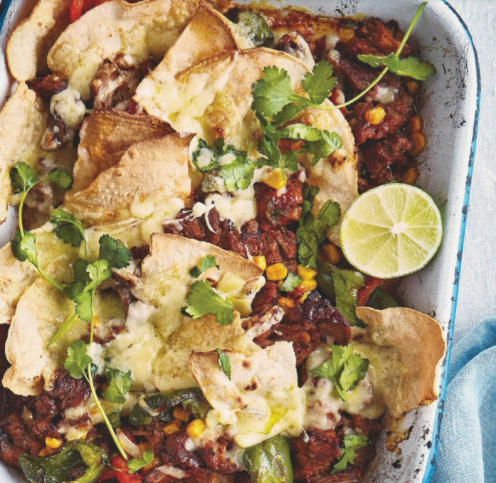 1. Нагрейте духовку до 200°C/180°C вентилятором/ 6. Нагрейте масло в кастрюле на сильном огне, затем добавьте мясо, лук и перец. Обжаривайте в течение 5 минут, затем добавьте смесь специй или приправу фахита и готовьте еще минуту.