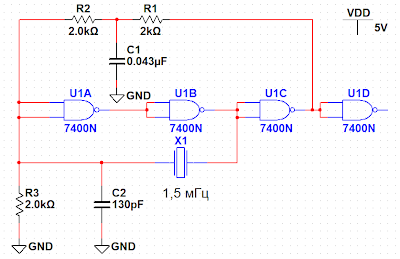 Кратко рассматривается простая схема кварцевого генератора с делителем, с скважностью 2.