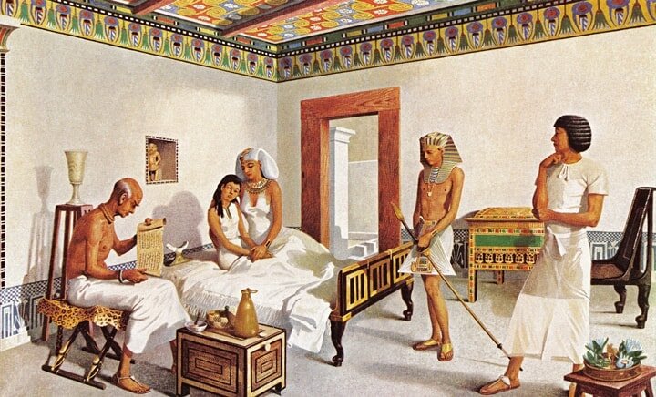 Врачи Египта считались лучшими в древнем Средиземноморском мире. Они использовали сочетание научных методов (наблюдение и диагностика) и магических ритуалов (заклинания и чары), чтобы исцелить. Пациентов можно лечить по рецепту - грудное молоко считается особенно эффективным ингредиентом - или с помощью небольшой хирургической операции.