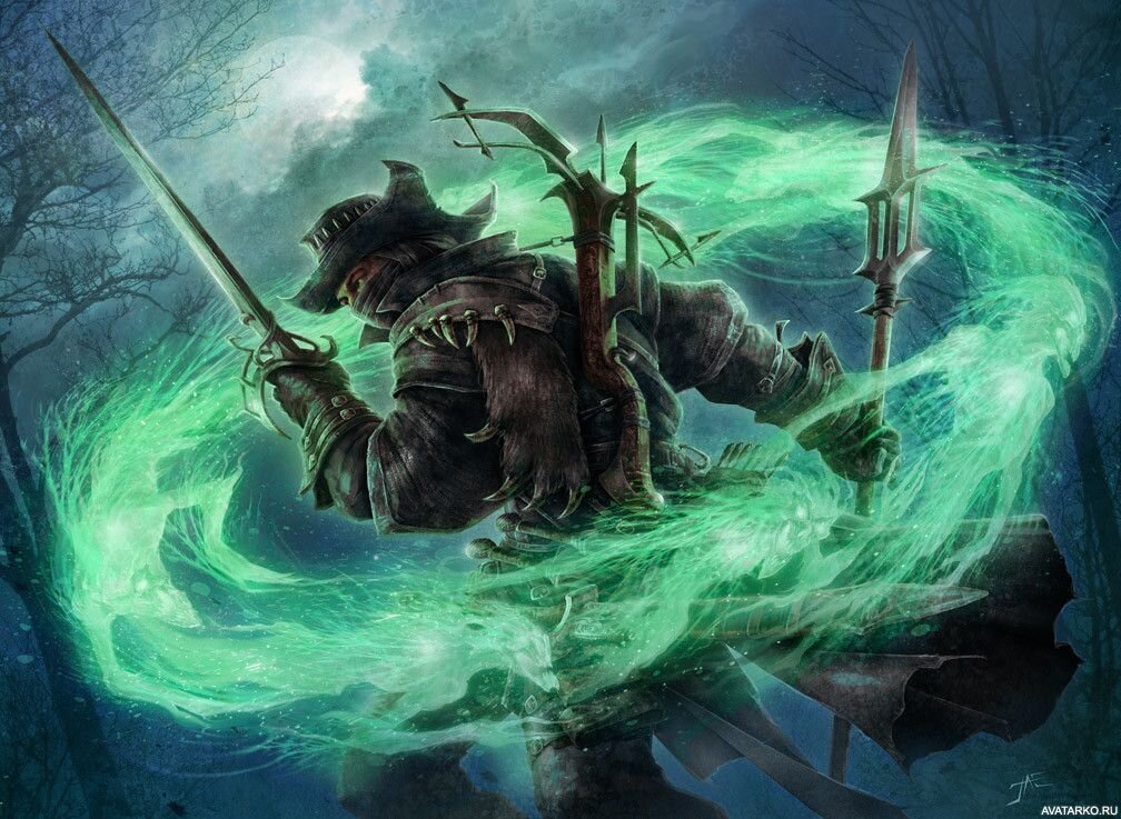 Шествовал вперёд он медленно, держа перед собой меч двумя руками. Напрягшись всеми мускулами, жилами, был начеку и готовился отразить любой внезапный удар, но никто не нападал, никто не вылезал из лож. Огромный зал заканчивался ступенями наверх, в зал по меньше, с выступами по бокам с колоннами, державшие потолок. Пол украшен был нарезными рунами, а в центре находился колодец с чёрной жидкостью. Как только в этот зал вступила нога ведьмака, жижа из колодца превратилась в чёрный сгусток. Из которого, материализовалась человекоподобная фигура, в виде человека в чёрном балахоне с диковинным посохом, с головой неизвестного существа, на макушке которого, в глазницах, сияли рубины. Этот человек не проронив ни слова, направил на ведьмака посох и выстрельнул в него чёрными сгустками.