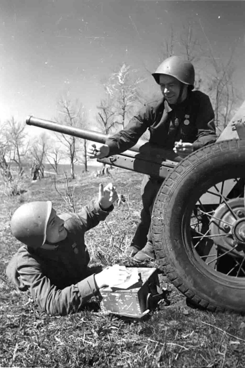 The team of the Soviet anti-tank 45mm 19-K gun model 1932 on vacation. The propaganda photo shows Soviet artillerymen in moments of rest: one, younger, writes the letter home, another shares the first spring flowers of the mother-and-stepmother.