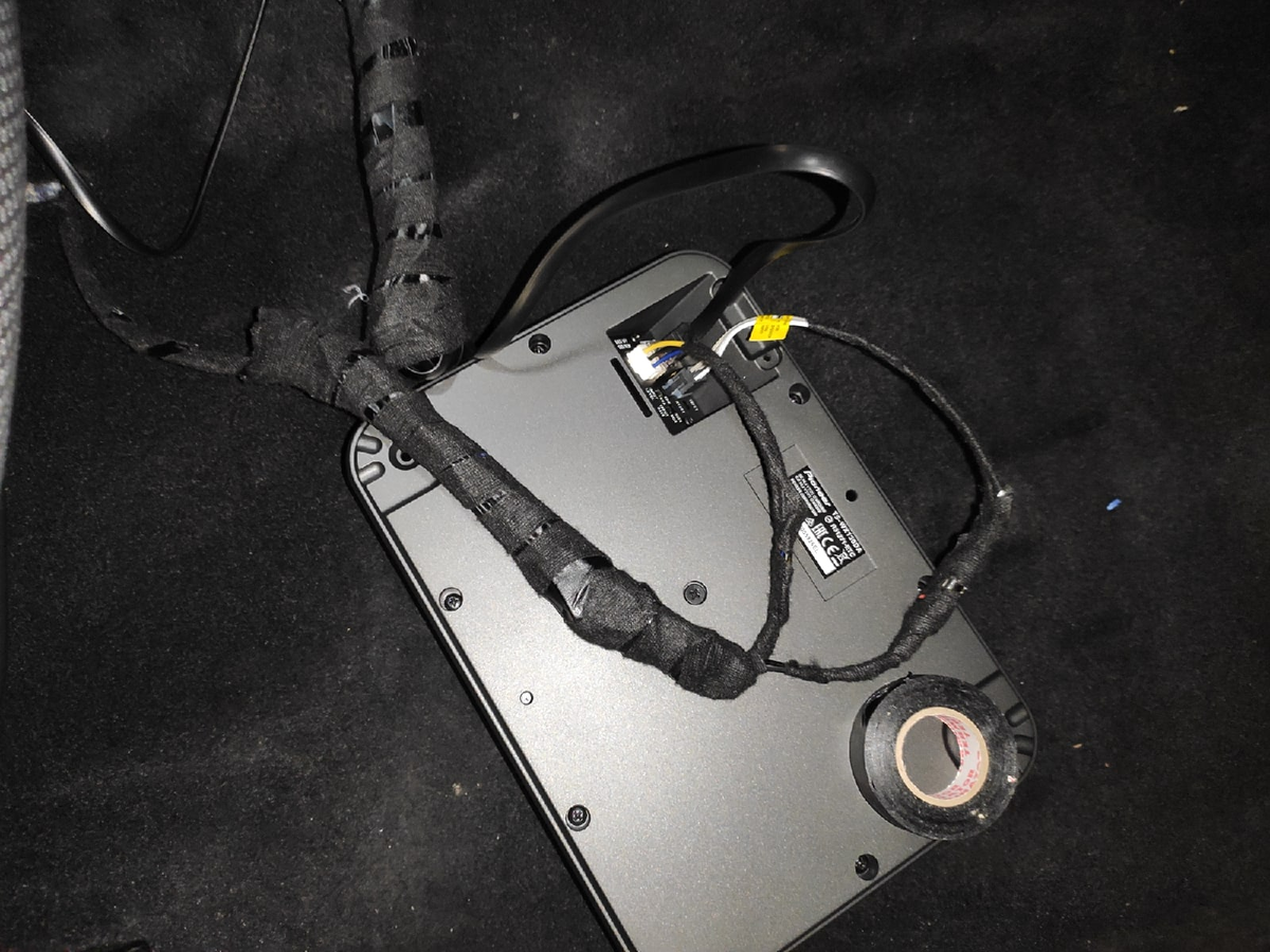 Прокладка проводов под ковролином, а фиксация к ковролину с помощью липучек. На всё ушло 2 часа, провода укорачивать не стал, собрал отдельно питание от акустики и обмотал тканевой изолентой, спрятались и не видно.