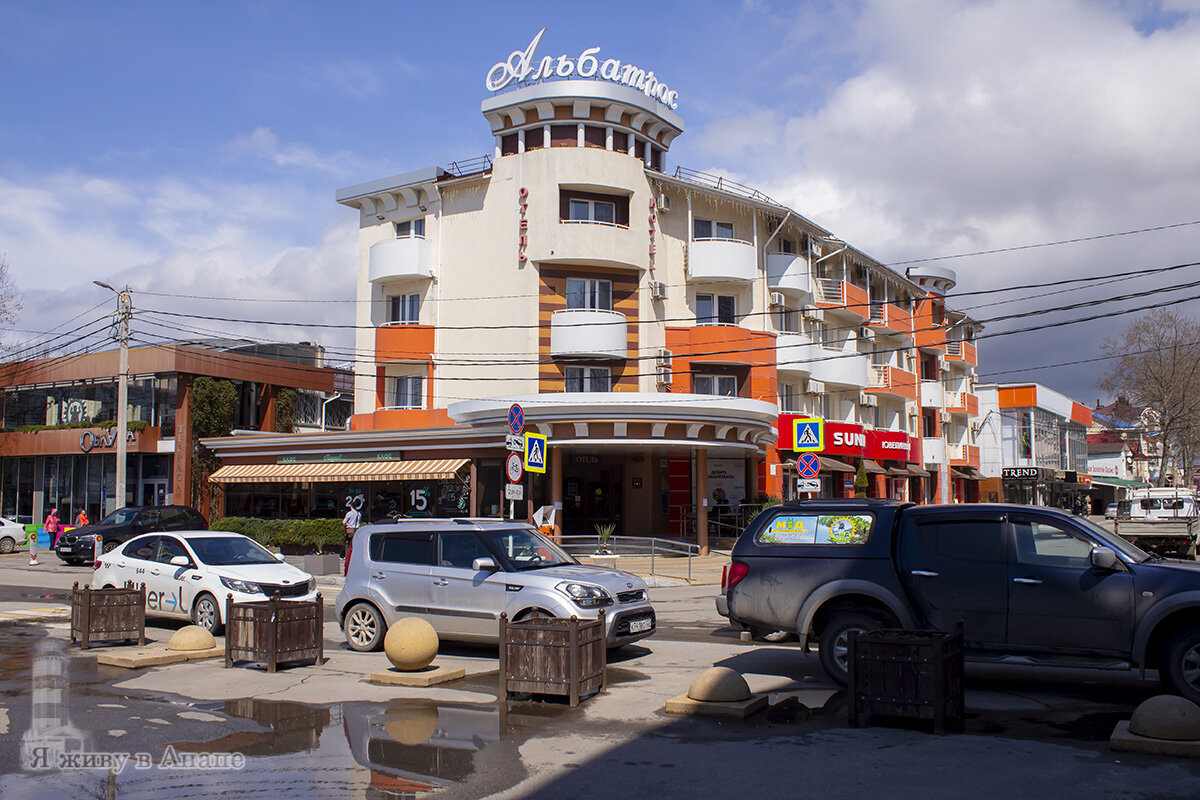 На самом перекрестке гостиница "Альбатрос". Симпатичное здание, яркое, как всегда рядом припарковано много машин.