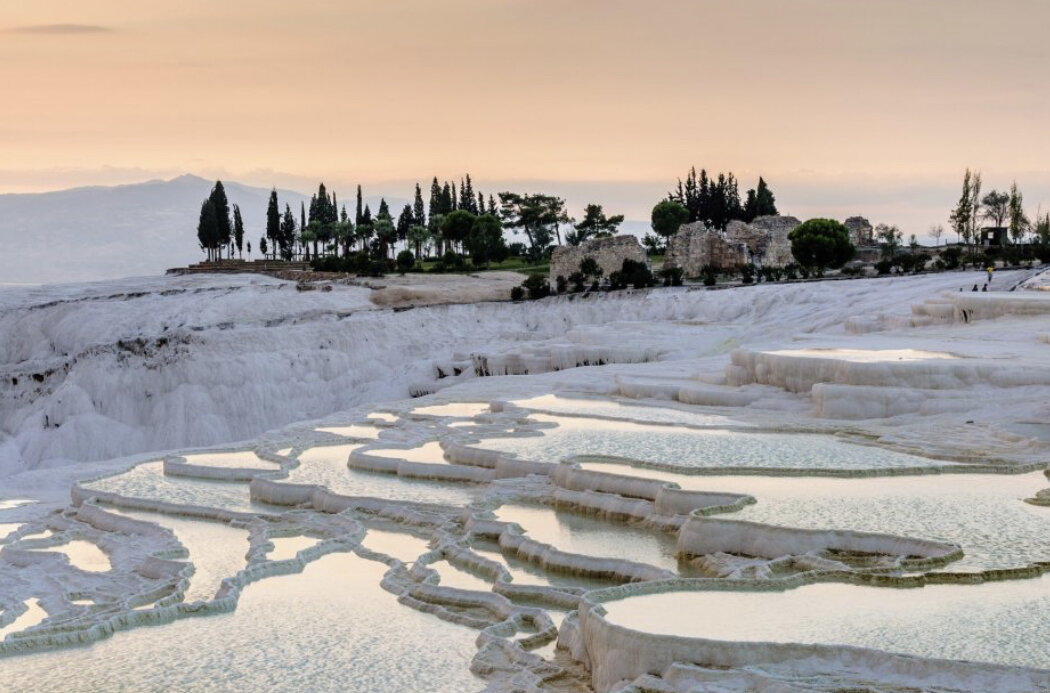 Памуккале – стабильно присутствует в многочисленных рейтингах самых красивых мест на Земле и это абсолютно заслуженно. Это ряд термальных источников, причудливым образом высекших «ступени» в белоснежном известняковом склоне. Сегодня сюда приезжают не только путешественники, желающие посмотреть на чудо природы, но и те, чьей целью является оздоровление, и они с удовольствием погружаются в неглубокие травертины. Есть на территории комплекса и более глубокая купель – бассейн Клеопатры. По легенде, сама Клеопатра захаживала сюда, чтобы расслабиться и омолодиться.