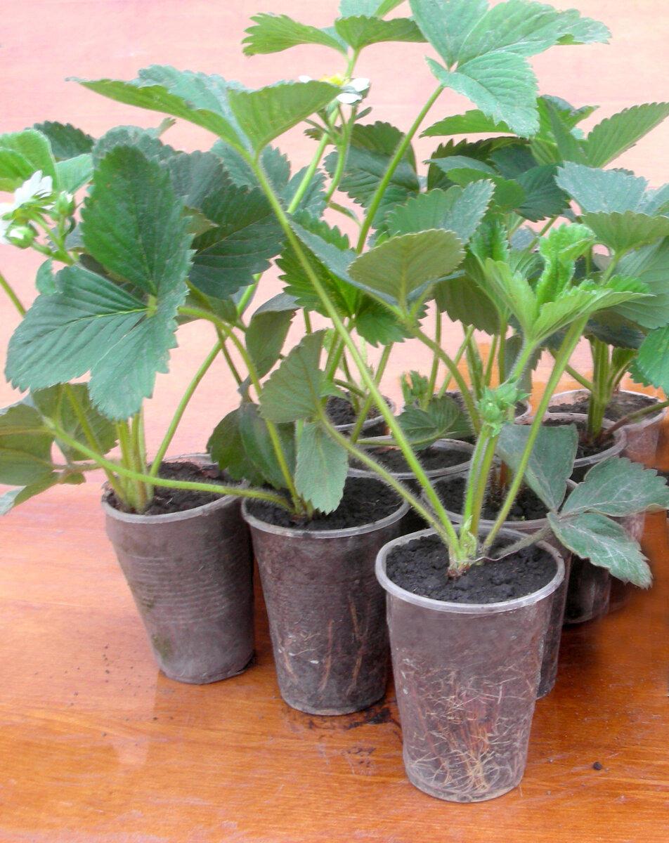 Заказал я для пробы всего десять корешков - по два корешка каждого сорта. Когда по почте пришли саженцы, я сразу же промыл их и высадил в подготовленную землю в пластиковые одноразовые стаканы. Корешки, согласно инструкции, я подрезал на расстоянии 5- 7 см. от корневой шейки, расправил их и посадил в стаканчики с огородным грунтом. Покупной грунт я не использую. Как заявлял производитель, что самая лучшая приживаемость происходит при температуре +7,+8 градусов. Пришлось вынести эти стаканчики с земляникой на застеклённый балкон из тёплой комнаты. В конце марта примерно такая и была на застеклённом балконе температура. Важно было только уберечь от прямых солнечных лучей молодые саженцы. Из десяти корешков земляники - фриго не прижился только лишь один корешок.