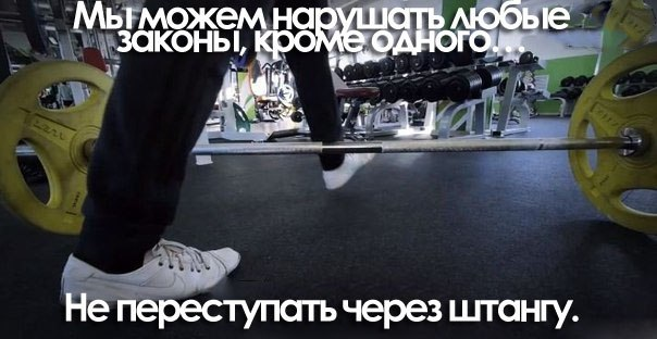 - Второе утверждение следует из первой аксиомы спортсменов. Согласно нему, если переступить через штангу, то она «обидится» и даже «может впоследствии отомстить». Например, на ответственных соревнованиях атлет не сможет взять вес, или на тренировке на ногу упадет «блин».