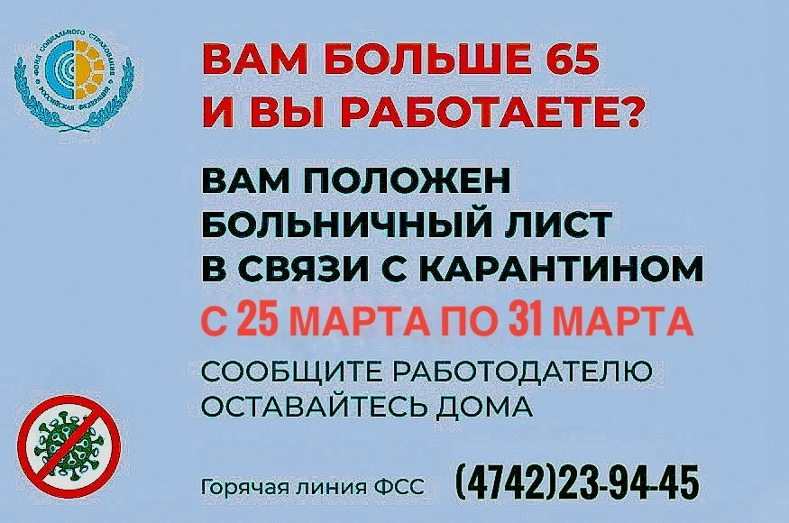Жителям Липецкой области старше 65 лет продлили карантинные электронные больничные с 25 марта по 31 марта.