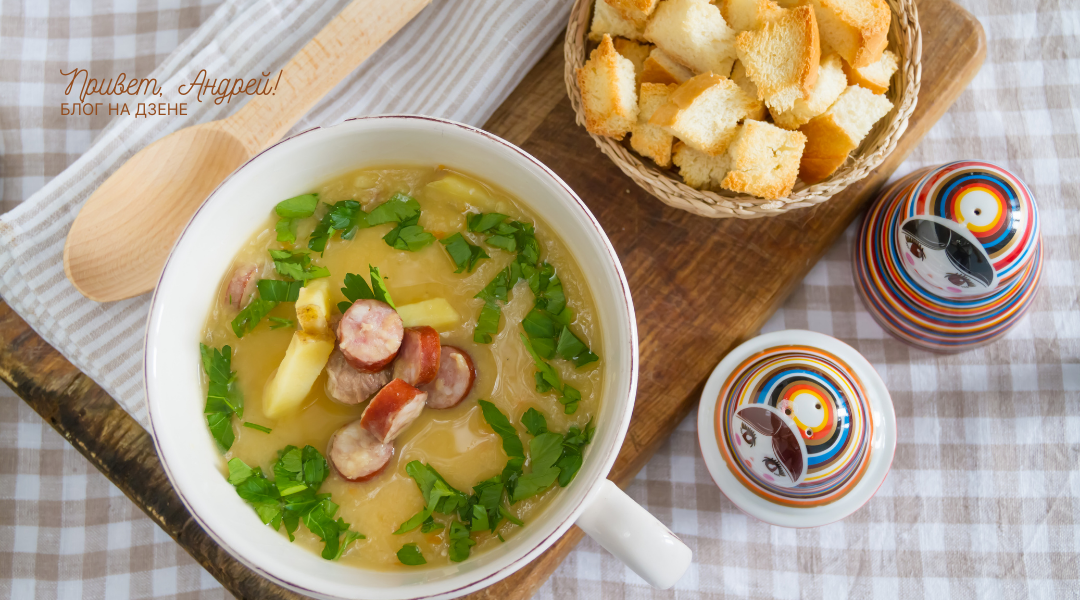 Я хочу отметить, что рецептов горохового супа множество. Сегодня я расскажу вам о своем простом и быстром (относительно) рецепте горохового супа с плавленым сыром, копчеными колбасками и золотистыми гренками.