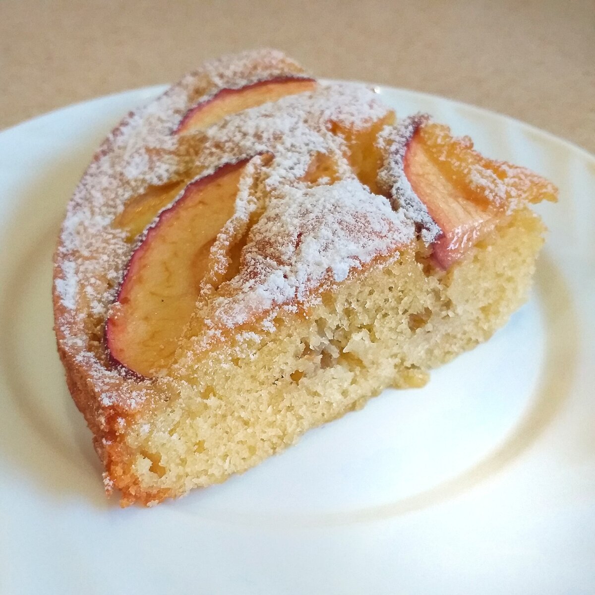 Эта шарлотка получилась нежной, но достаточно плотной. По структуре напоминает кекс. Тесто с лёгкой ноткой сливочного масла и ароматом